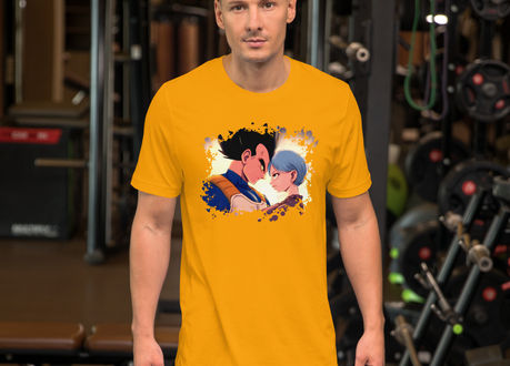 Don't miss your chance to own a piece of Dragon Ball history with the exclusive Passionate Saiyan Stare T-Shirt, featuring the enchanting artwork of Leanore. Order yours today and experience the love and romance of Bulma and Vegeta from the Dragon Ball franchise in comfort and style.
