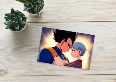 This Dragon Ball Romance Postcard, features the captivating artwork of Leanore, created during a live stream event on March 14th, 2024. This exclusive postcard showcases the iconic characters Bulma and Vegeta from the beloved Dragon Ball franchise, in a tender, romantic moment, gazing into each other's eyes with love and admiration.